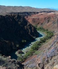 Pliocene deposits with complex forms of weathering in the form of cornices and niches are exposed on the slopes of the canyon. The canyon here is exceptionally attractive. In the lower reaches, the river becomes flat and wide, this place is called Sartogay (Yellow Forest), there is a Relic ash grove 22 kilometers long. In the vicinity of the Sartogay valley, Aktobe, Zhagargyozen, Dungan canals depart from the riverbed, the waters from which are used to irrigate agricultural land in the Uyghur region.