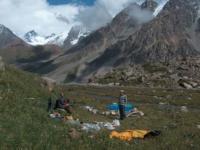 Breakfast. The further way from the camp on confluence of Tourists and the Left Talgar turns on the southwest and lies along the right river bank of Tourists which prevails nachal from a glacier the Tourist. The green grass zakanivatsya soon and our way lies on stones of a moraine of a glacier of Tourists.
