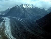 The lower part of the Bivachny glacier (from the Oshanin glacier to the Fedchenko glacier) is completely covered by moraine deposits, there are many lakes, the surface of the glacier is very uneven and difficult to pass.