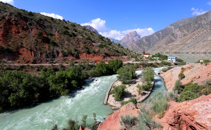Below the source, the channel runs between rock massifs. On the banks of the river there are settlements Narvad, Dijik, Khayronbed. The Iskanderdarya River has a complex basin system, at an altitude of 2,194.8 meters above sea level, the river flows out from the northeastern side of Iskanderkul Lake.