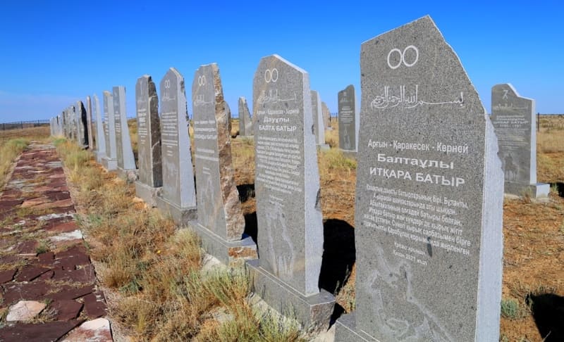 The monument to the Battle of Bulanty was erected in honor of the 550th anniversary of the Kazakh Khanate. The complex is surrounded by a metal fence, and a massive metal gate was built at the entrance. The monuments are located on a hill and are approached by concrete steps, surrounded by four plastic steles, which are located two on the right and left sides.