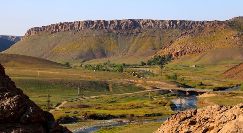 The slopes are dissected by large and small gorges and dry riverbeds. Tops are flat, aligned. To the south-west, from the Karatau ridge, the valley of the Syr-Darya river departs, to the north-east - the valley of the Talas river.