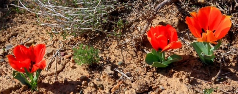 The soils are mountain chestnut, mountain brown. The vegetation is mountain-steppe, feather-grass-fescue, fescue and shrubs. There are tugai strips along riverbeds. Rubber (tausagyz) contains 35 - 40; rubber and nowhere, except for Karatau, does not grow in the republic.