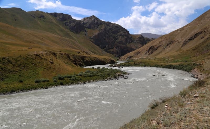Taking a large number of tributaries, the main of which are the Atbashi, Alabuga - on the left, Kekdzherty and Kökemeren - on the right, the Naryn cuts through the Ferghana Range. Having entered the Fergana Valley, the Naryn loses the character of a mountain river and, flowing along its alluvial fan, breaks into branches and forms a pebble floodplain up to 3.5 kilometers wide.