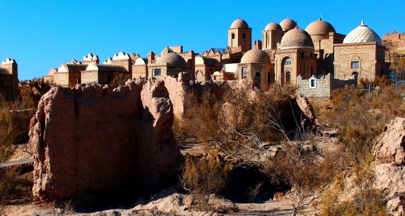 The necropolis contains a number of architectural monuments, the mausoleums of Mazlumkhan slu, Khalifa Erezhep, Shamun nabi and the Jumart kassab hillock. On the slopes of a placer of pottery fragments of the XIIth - XIVth centuries. it is believed that the remains of an ancient building are hidden under the hillock.