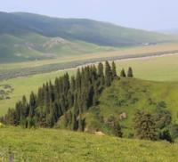 Подъём на Кызыл-кия не крут; довольно отлог и спуск к р. Джиргалану, который гут течёт по совершенно степной равнине, верстах в трёх-четырёх от подошвы Кызыл-кия. Течение Джир-галана по степи обозначается длинным рядом лиственных деревьев, преимущественно осокорей, отчасти и берёз; есть даже редко рассеянные ели, выросшие из унесённых рекой из горных ельников и выкинутых на берег шишек.