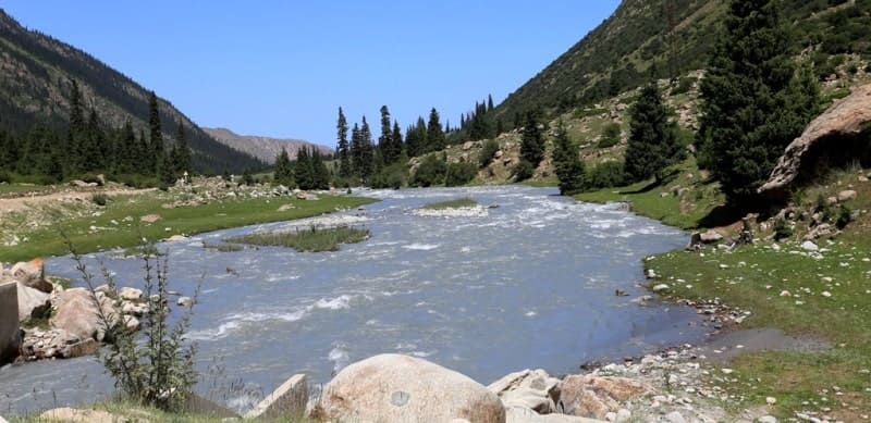 The bottom of the Barskoon gorge is narrow (no more than 100-150 meters), in places it forms expansions (up to 300-400 meters), cut and deepened by the Barskoon River and its tributaries. The lower part of the gorge, where there are hanging glaciers and snowfields, is laid within the foothills, composed of tertiary, mainly Neogene conglomerates and loess-like loams of the anthropogene.