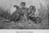 The tiger had already managed to run across the intersection of the paths, but the dog managed to catch up with him and grab his back. Then the tiger, abandoning its prey, ran a little ahead and began to turn in order to throw off and tear apart its little enemy, which he finally succeeded in, but here he was struck by two lethal shots of the hunter pursuing him; however, he still had enough strength to go down to the stream, get drunk in it and breathe his last breath on its shore.