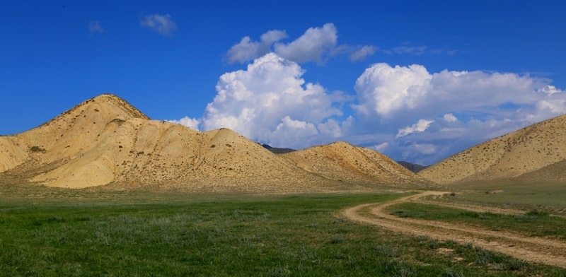 The mountains are cut by dry stream beds, which are filled with water depending on precipitation, spring and autumn floods. The vegetation on the uplands is represented by xerophytes, and there is a salt marsh barnyard, or biyurgun (Anabasis salsa).