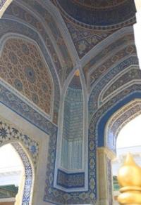 Two halls, a mosque-audience and a tomb are covered with domes. Pa intersecting arches, above which rise the outer azure dome. The tiled mosaic decor of the main and courtyard facades was created entirely in the traditions of the past century, but new features appeared. Interspersed with majolica inserts in the alabaster molding of semi-domes of courtyard portals, decorative flat domes of corridors leading to the courtyard with masonry of polished brick and a turquoise grid of seams filled with stripes of tiles.