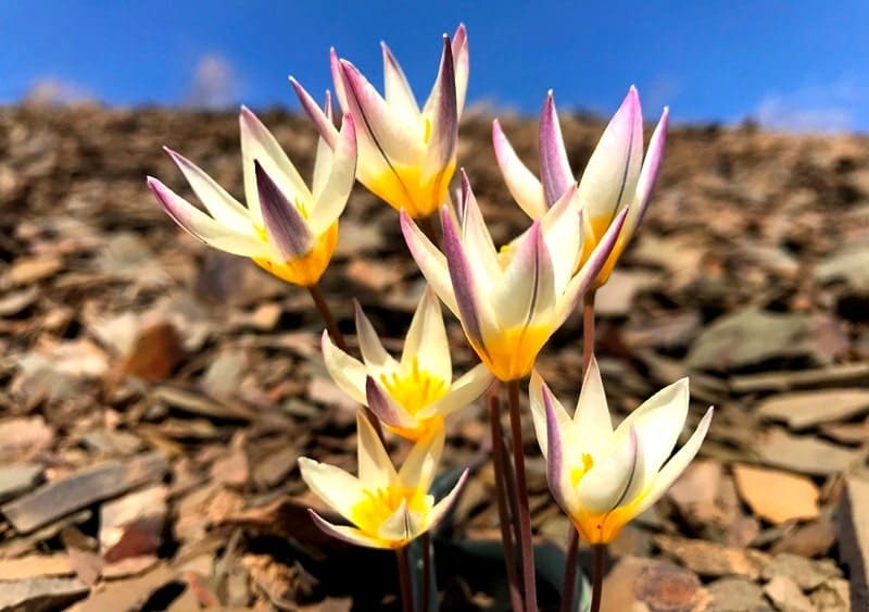 Горные степи занимают вершины хребта на высоте 600 - 770 метров, где лучше развит растительный покров. Однако, его видовой состав здесь беднее. Среди трав преобладают осока, злаки, встречаются копетдагский эремурус, тюльпаны, ирисы, иксиолирион.