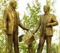 The total height of the sculpture is five meters. Akhmet Baitursynov and Myrzhakyp Dulatov are depicted in the dialogue, holding a map of Kazakhstan in their hands. The monument organically fits into the cultural and memorial complex in the settlement of Torgai.
