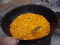 Плов по-казахски. В хорошо разогретый в казане жир кладут нарезанный кольцами лук и обжаривают до золотистого цвета. Мясо, нарезанное крупными кусками, вместе с луком обжаривают до образования румяной корочки. Затем добавляют нарезанную соломкой морковь, перец и соль и жарят все до полуготовности.