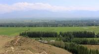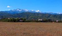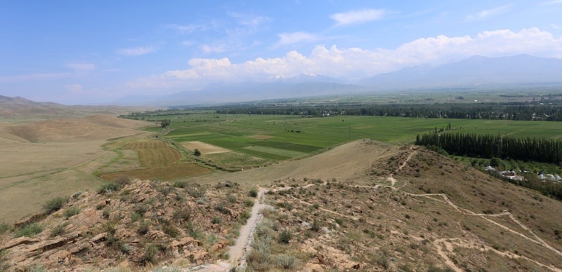 Вдали за селом виднеются склоны Таласского Алатау. Они выглядят массивнее, выше и шире по сравнению со склонами Киргизского. Кое-где выступают предгорья. Самая высокая вершина хребта, расположенная в западной части, - Манас имеет высоту 4482 метров над уровнем моря.
