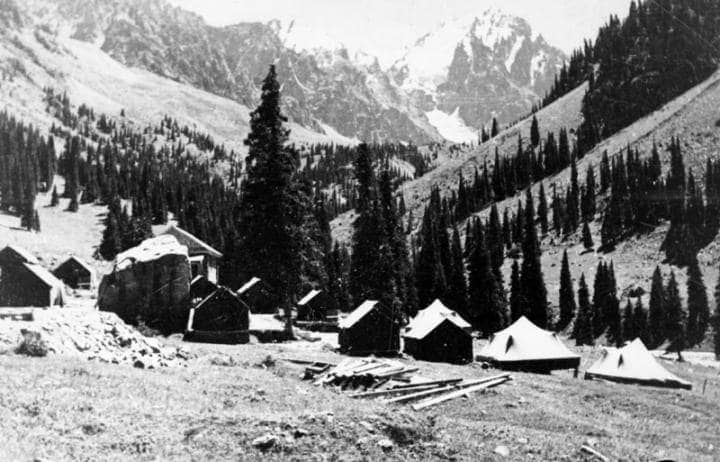 С этого моста уже виден Талгарский горный узел со сверкающими белизной ледниками. Склоны ущелья очень крутые, скалистые, с ясно видными бороздами от схода снежных лавин. Через полчаса пути по сравнительно хорошей тропе среди ельников, произрастающих на древней морене, подходим к лагерю альпинистов, который расположен на высоте 2650 метров над уровнем моря в 9,5 километрах от перевалочной базы и в 22 километрах от магистральной дороги Алматы - Талгар - Тургень.