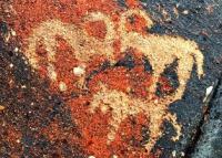 Выделяется сцена охоты на горных баранов, косуль и оленя, в которой главный герой - конный лучник - изображен очень реалистично: человек показан по пояс и развернут назад, вооружен большим сложным луком со стрелой.