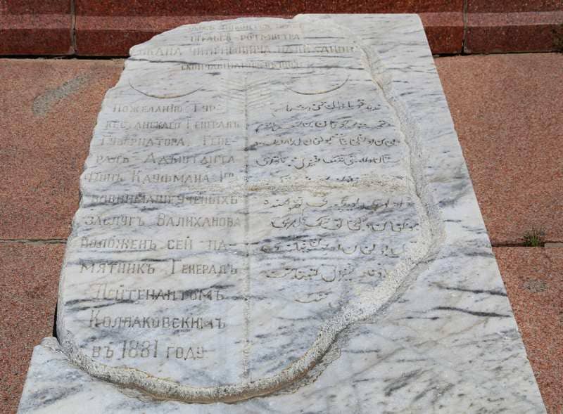 - «Здесь покоится прах штабс-ротмистра Чокана Чингисовича Валиханова, скончавшегося в 1865 году. По желанию туркестанского генерал-губернатора Кауфмана 1-го, во внимание ученых заслуг Валиханова, положен сей памятник генерал-лейтенантом Колпаковским в 1881 г.».